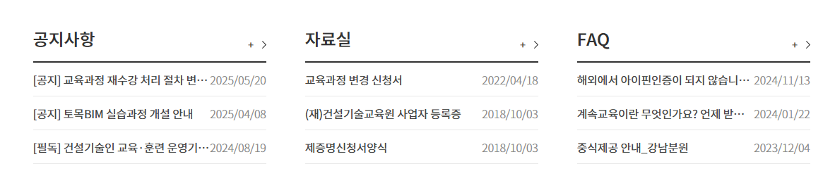 - 전문과정 및 실무과정: 토목, 건축, 안전관리 등 분야별 전문 교육 콘텐츠를 제공하며, BIM 실습과정 같은 특화 과정도 운영됩니다.