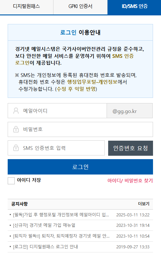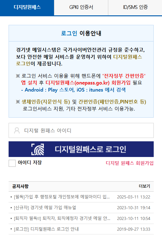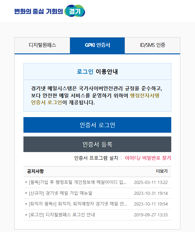 A1. 경기넷 메일은 디지털원패스, GPKI 인증서, 또는 ID/SMS 인증 방식 중 하나를 이용해 로그인할 수 있습니다. 보안을 위해 일반적인 아이디·비밀번호 로그인을 지원하지 않습니다.