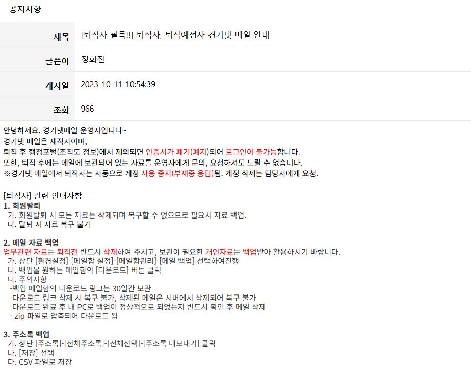 A3. 퇴직자 또는 퇴직 예정자는 일정 기간 동안 메일 시스템에 접근이 가능하지만, 이후에는 접근 권한이 제한됩니다. 중요한 자료가 있다면 퇴직 전에 백업을 완료해야 하며, 관련 안내문을 반드시 확인해야 합니다.