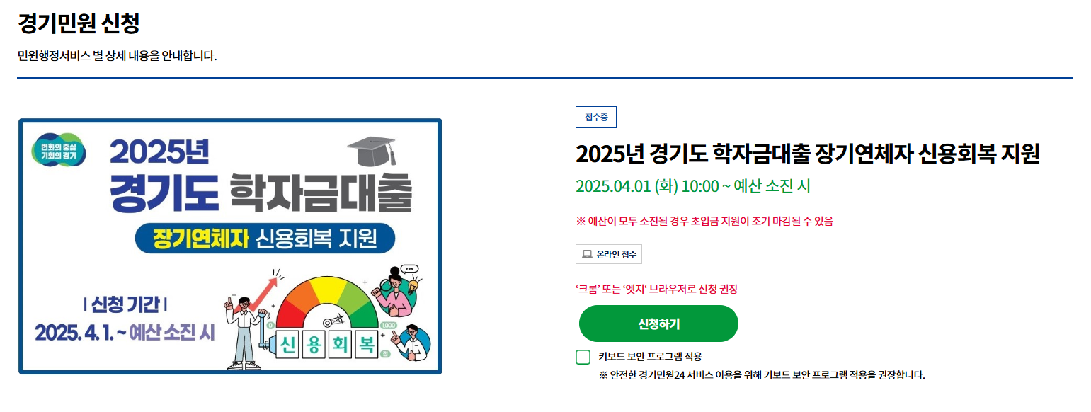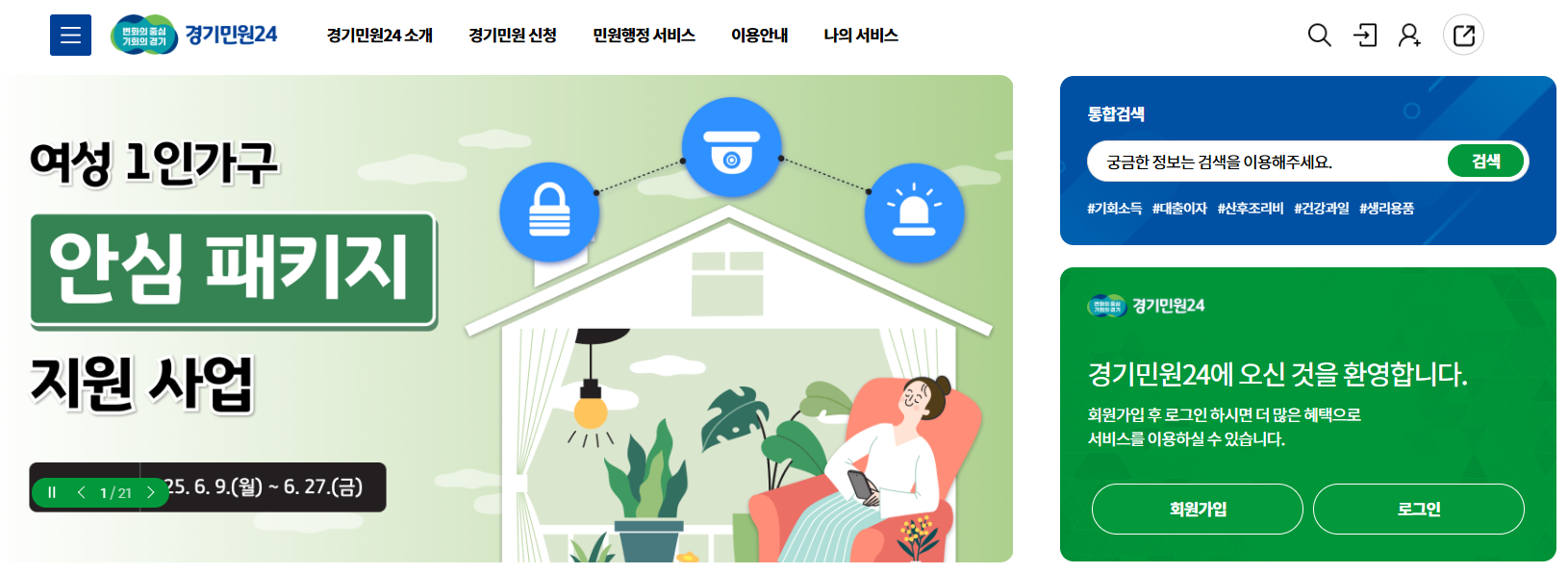 ‘경기민원24’는 경기도청에서 운영하는 공식 온라인 민원 서비스 포털입니다. 도민들이 행정기관을 직접 방문하지 않고도 다양한 복지, 정책, 생활 밀착형 행정서비스를 비대면으로 신청할 수 있도록 돕기 위해 개설되었습니다.