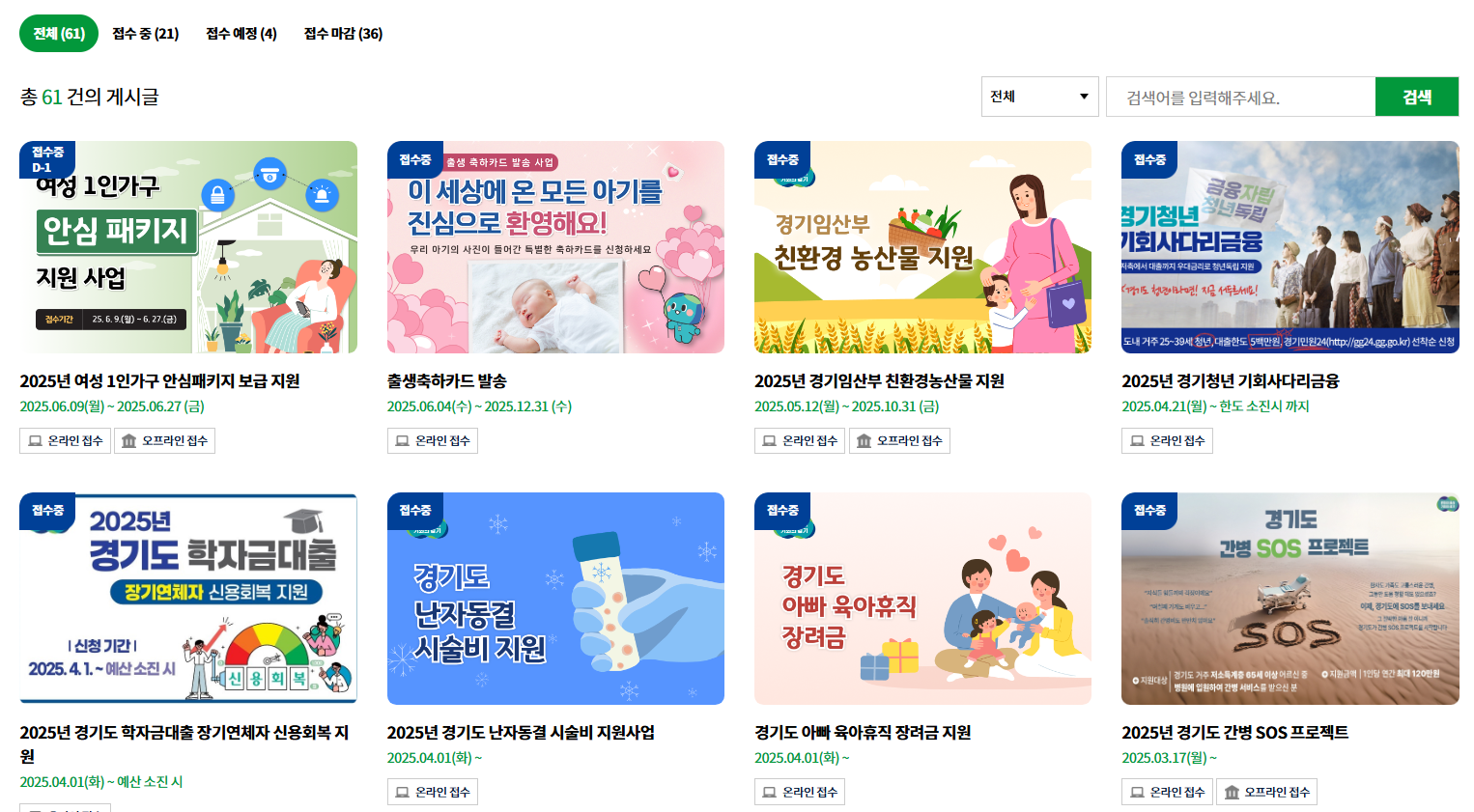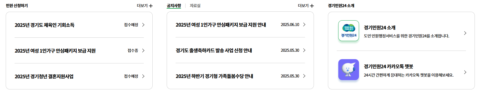 현재 경기민원24 누리집에서는 연중 혹은 분기별로 다양한 사업들이 접수되고 있습니다. 사용자가 놓치기 쉬운 주요 정책도 누리집 첫 화면에서 실시간으로 확인할 수 있습니다.
