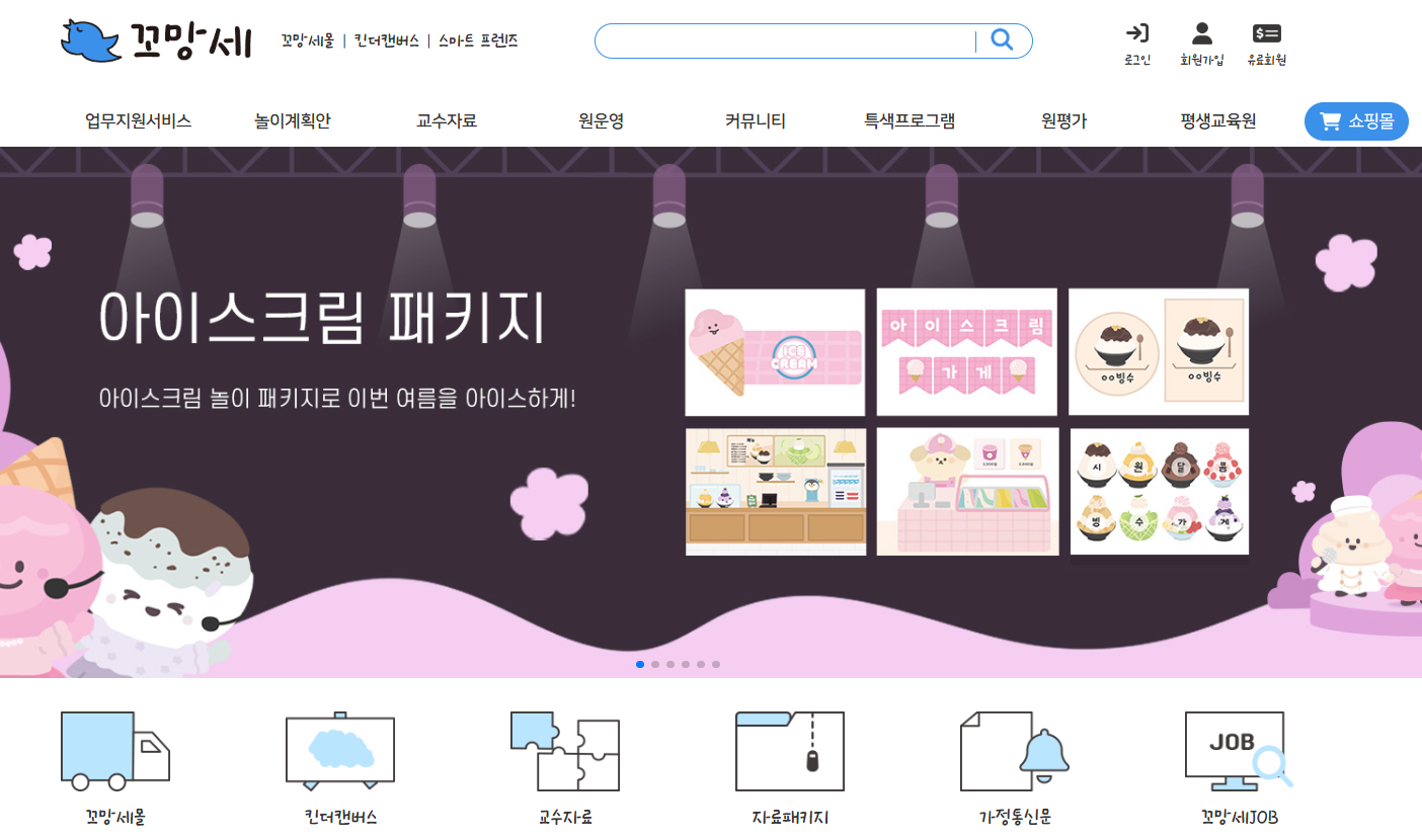 꼬망세는 자료뿐만 아니라 교재교구 쇼핑도 함께 할 수 있는 콘텐츠 마켓과 쇼핑몰을 운영합니다. 시즌별 패키지 상품, 만들기 재료, 미술활동 도구 등을 바로 구매할 수 있어 교육 준비를 한 번에 해결할 수 있습니다.