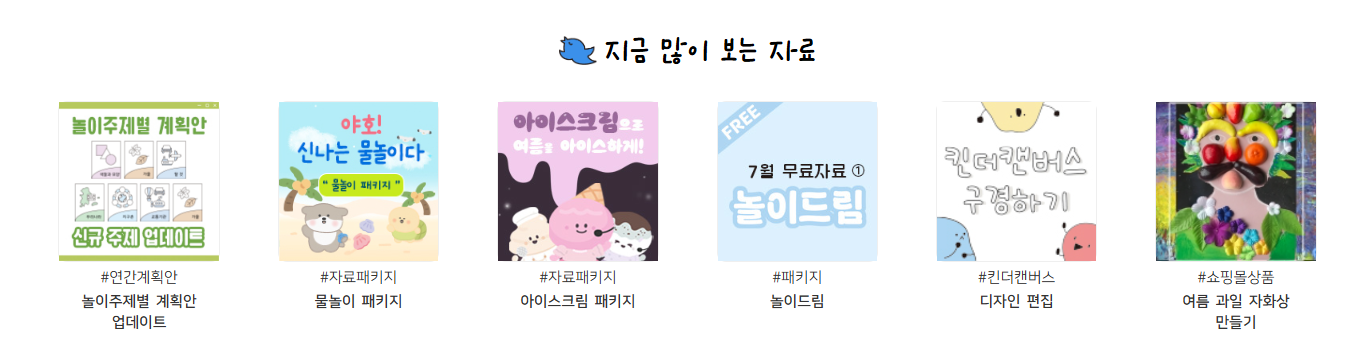 현재 인기 있는 패키지로는 여름놀이, 아이스크림 만들기, 물놀이 자료 등이 있으며, 다양한 테마별 스티커, 부채 만들기, 냉장보관용 키트 등 창의적인 활동도구도 다양하게 구성되어 있습니다.