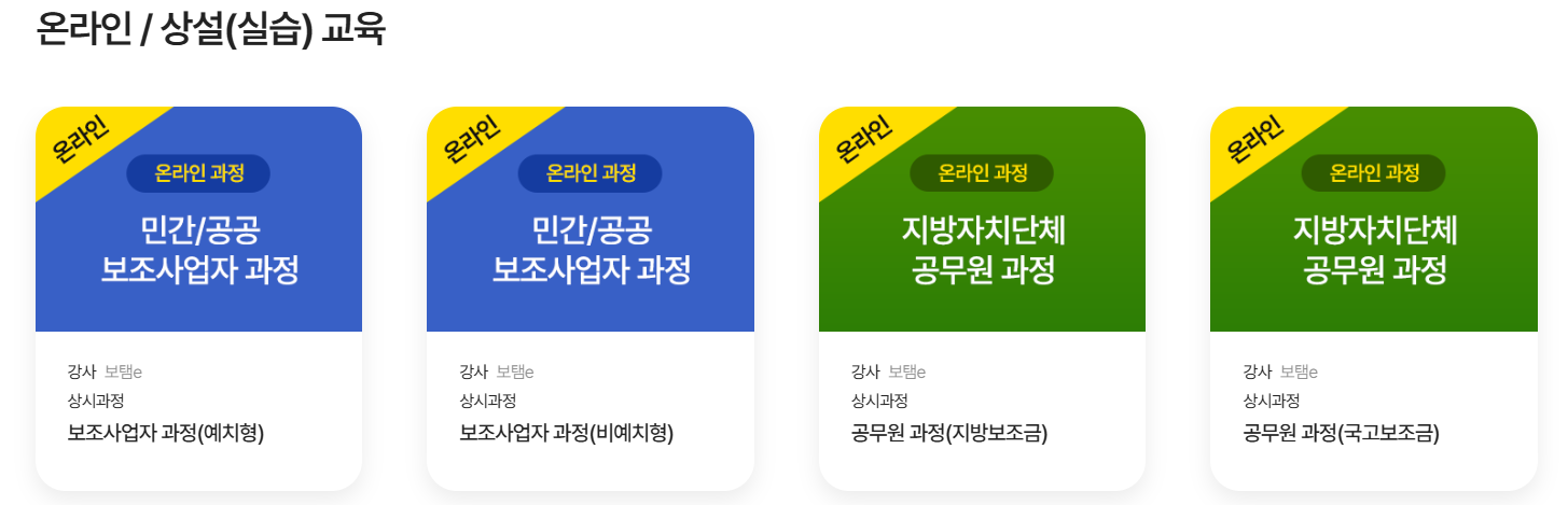 보탬e 교육 시스템에서는 공무원과 보조사업자 각각을 위한 전용 과정이 운영되고 있습니다. 각 과정은 지방보조금 유형(예치형/비예치형)에 따라 세분화되어 있으며, 업무 단계에 맞춘 학습 순서를 따릅니다.