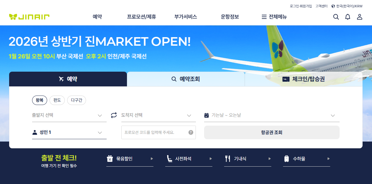 진에어 홈페이지 바로가기 (www.jinair.com/)