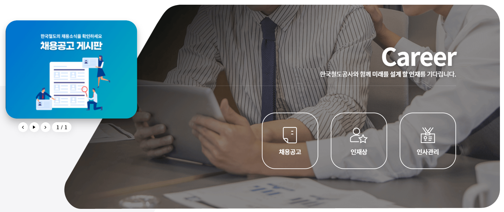 특히 ‘채용정보’ 메뉴를 통해 공사의 인재상, 채용공고, 인사제도에 대한 상세한 내용을 확인할 수 있어 취업 준비생들에게 매우 유용한 공간입니다.